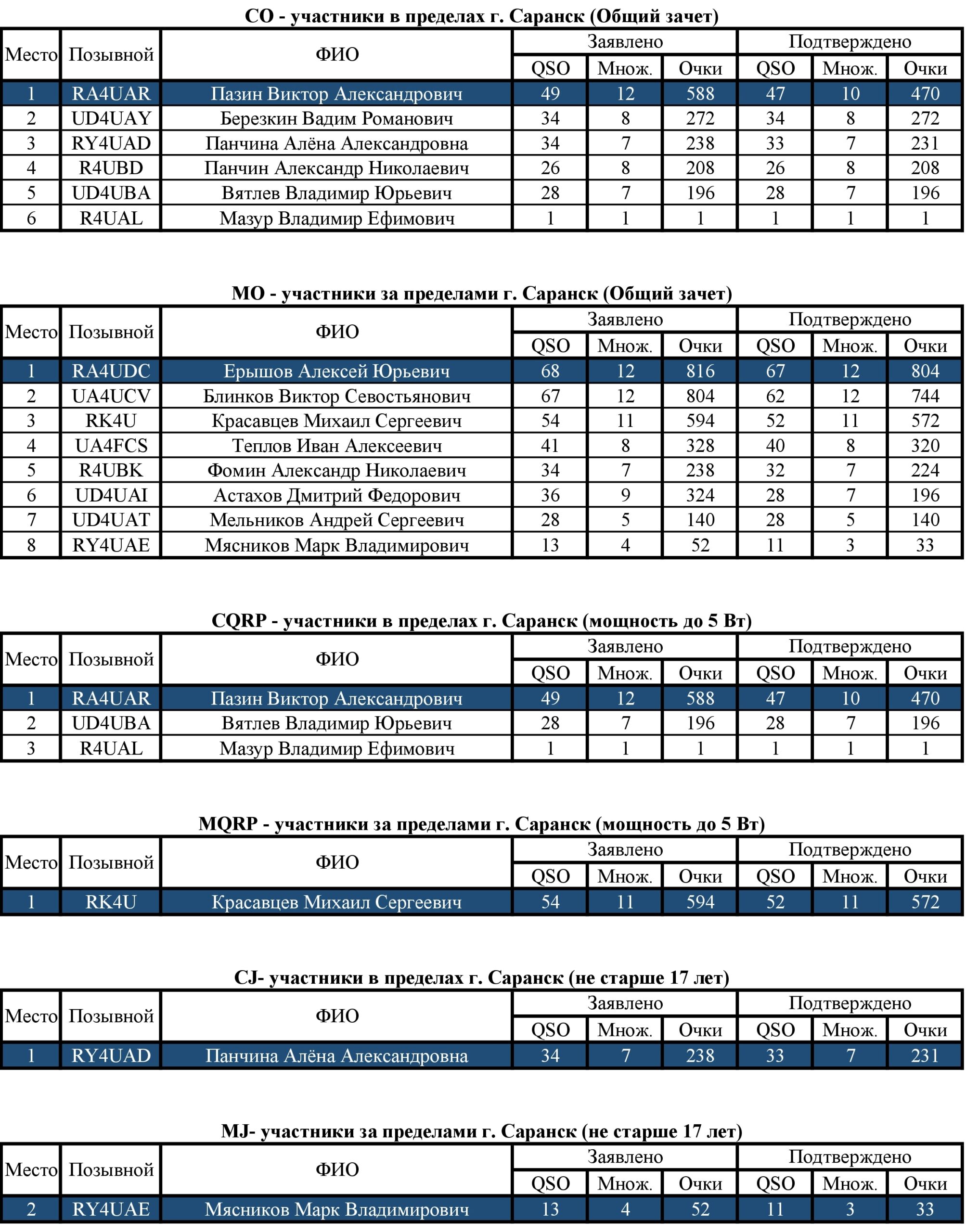 В этапе приняли участие 14 радиоспортсменов (6 – из г. Саранск, 6 – из г. Рузаевка, 1 – из п. Кадошкино, 1 – из других регионов РФ), в т.ч. 2 участника в возрасте до 18 лет.